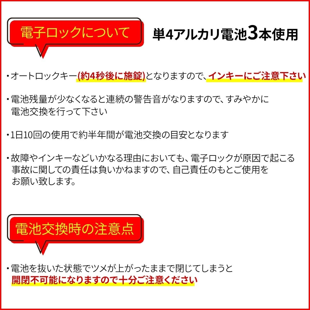 ・故障やインキーなどいかなる理由においても、電子ロックが原因で起こる事故に関しての責任は負いかねますので、自己責任のもとご使用をお願い致します。
