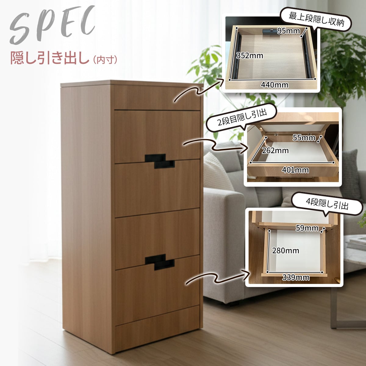 4段目隠し引出:W339mm D280mm H59mm