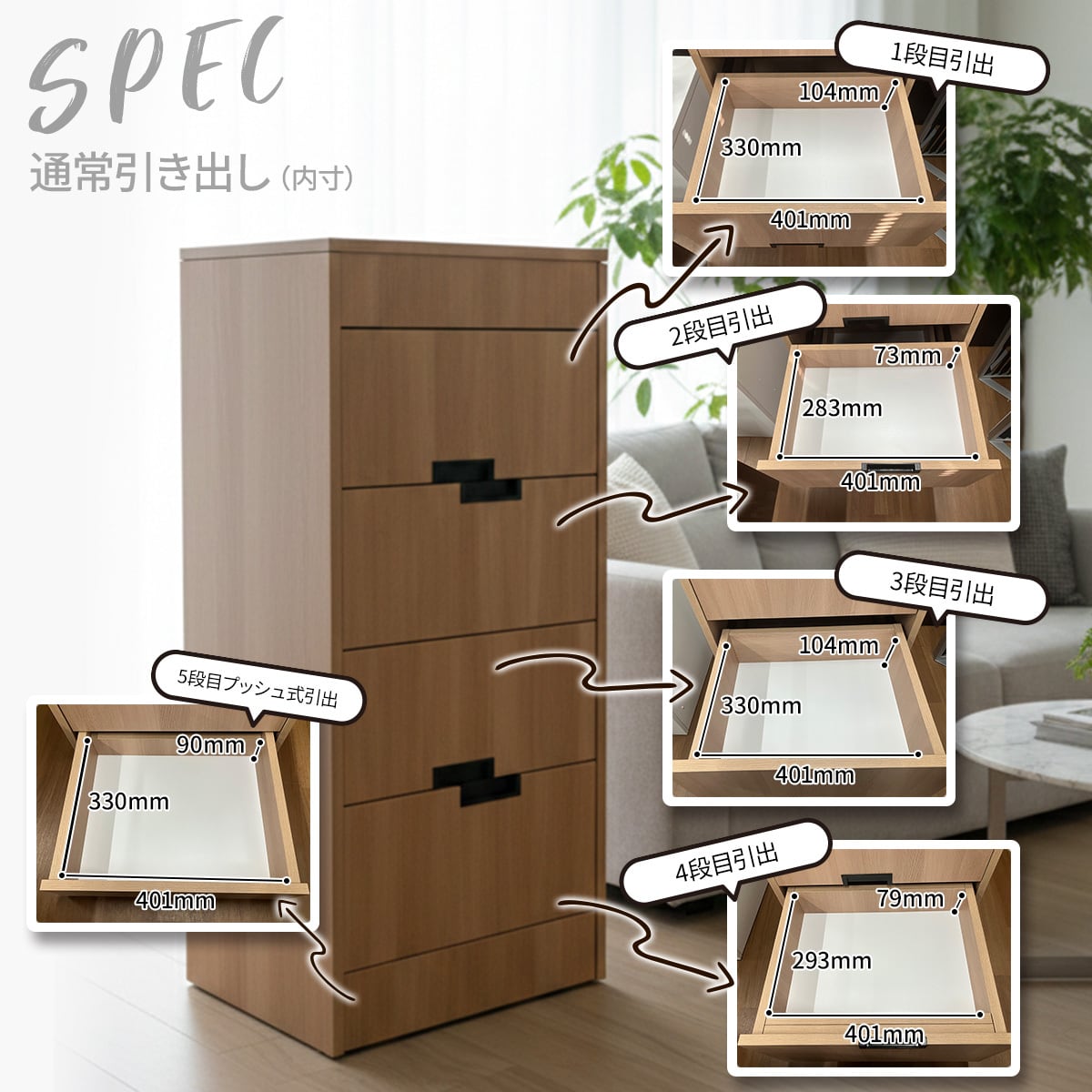 5段目プッシュ式引出:W401mm D330mm H90mm